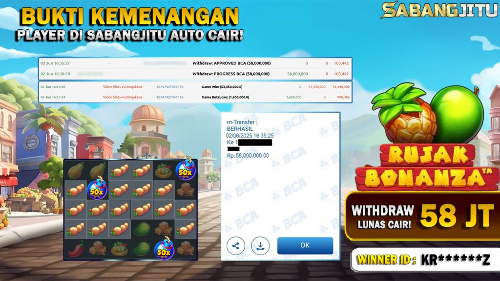 BUKTI KEMENANGAN 02 JUNI DI GAME RUJAK BONANZA WITHDRAW RP 58.000.000.,-