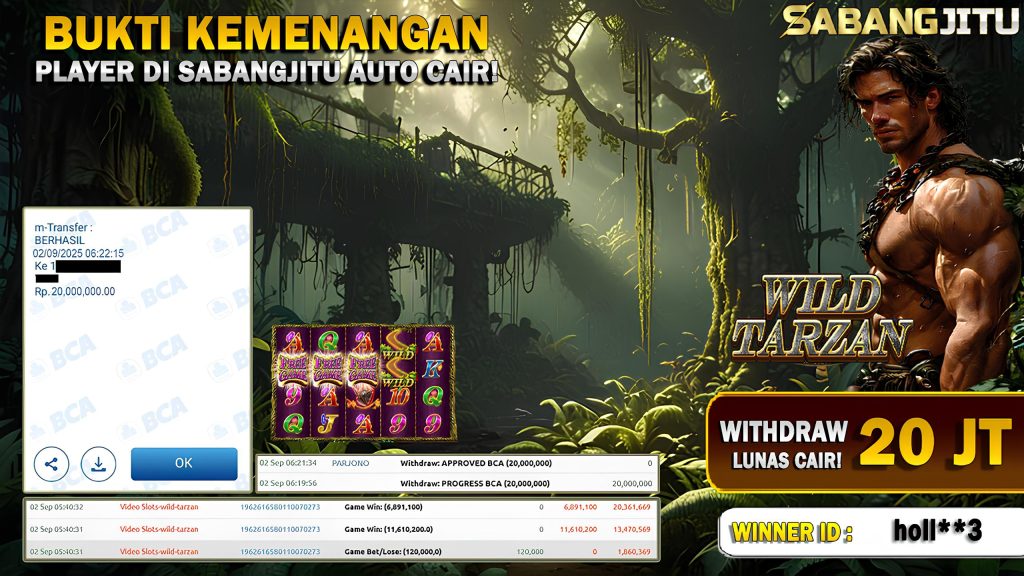 BUKTI KEMENANGAN 02 SEPTEMBER DI GAME WILD-TARZAN WITHDRAW RP 20.000.000.,-