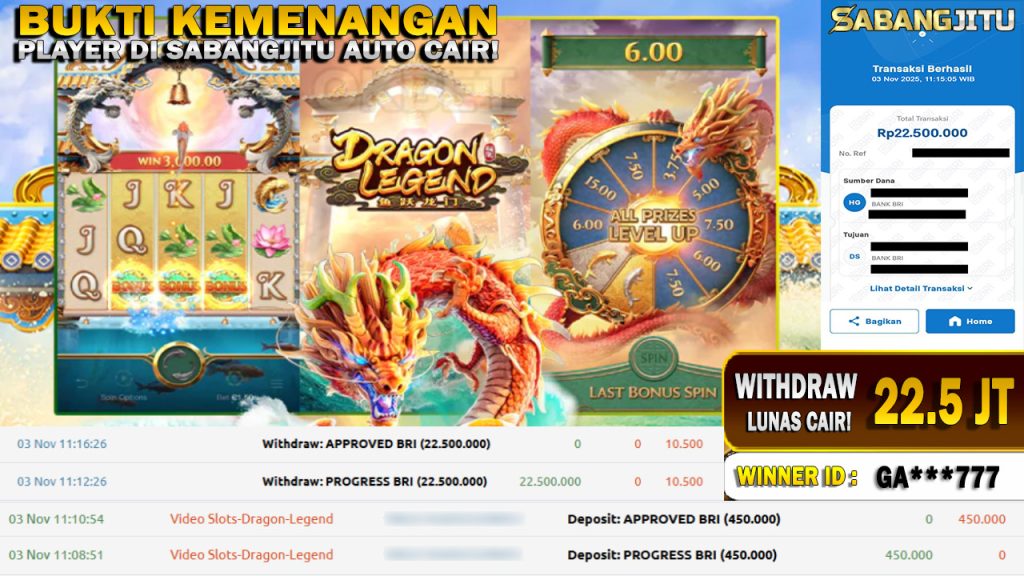 BUKTI KEMENANGAN 03 NOVEMBER DI GAME Dragon Legend WITHDRAW 22.500.000.,-