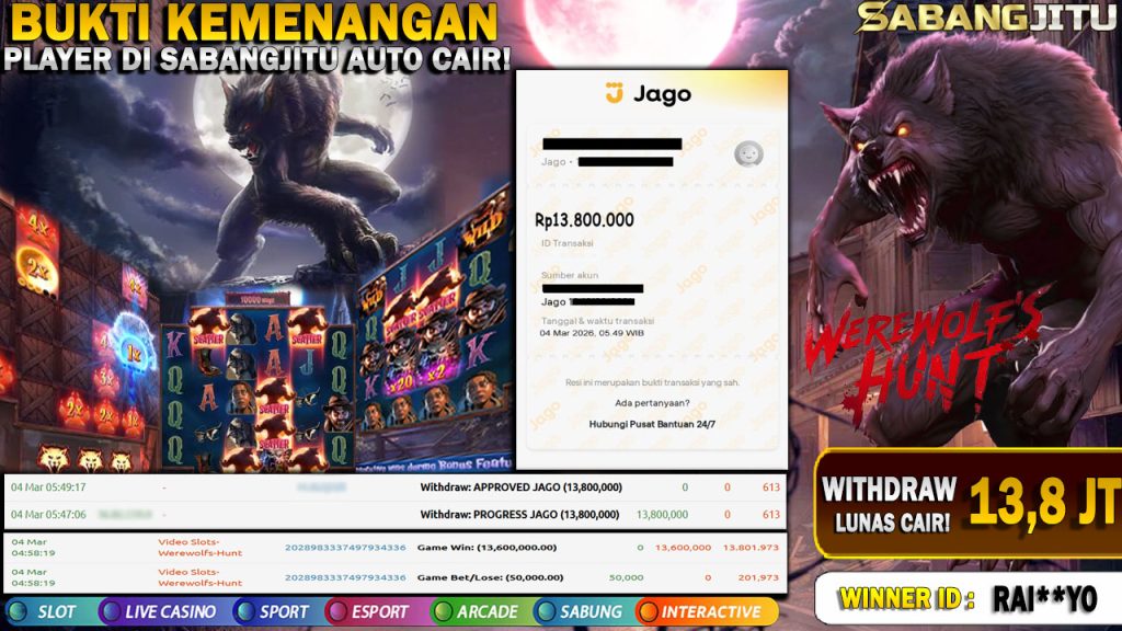 BUKTI KEMENANGAN 04 Maret DI GAME WEREWOLF’S HUNT-PG-SOFT WITHDRAW RP 13.800.000.,-