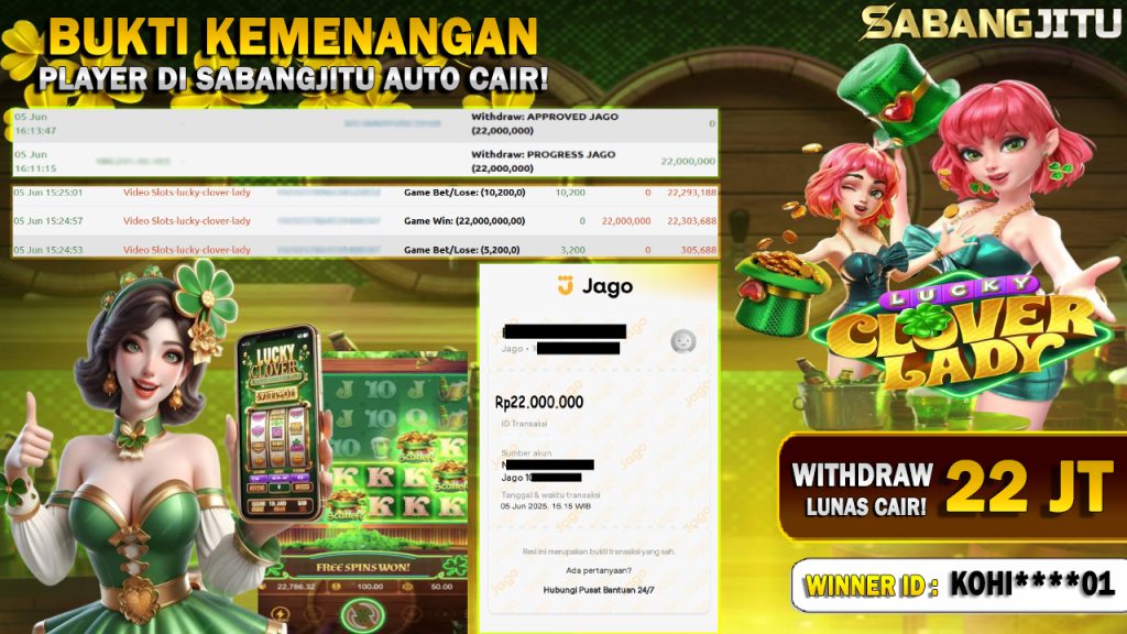 BUKTI KEMENANGAN 05 JUNI DI GAME LUCKY-CLOVER-LADY WITHDRAW RP 22.000.000.,-