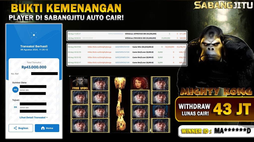 BUKTI KEMENANGAN 06 AGUSTUS DI GAME MIGHTY KONG WITHDRAW RP 43.000.000.,-