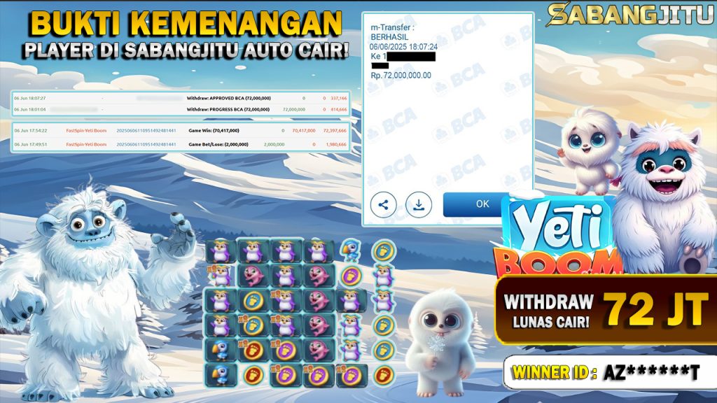 BUKTI KEMENANGAN 06 JUNI DI GAME YETI BOOM WITHDRAW RP 72.000.000.,-