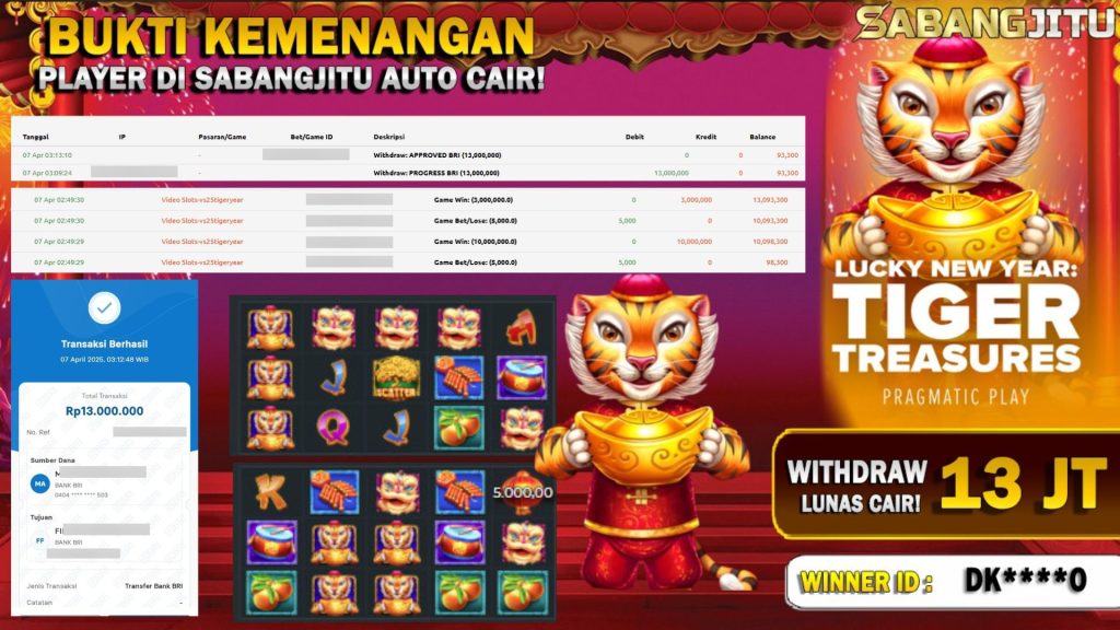 BUKTI KEMENANGAN 07 APRIL DI GAME LUCKY NEW YEAR TIGER TREASURES WD RP 13.000.000.,- JUTA