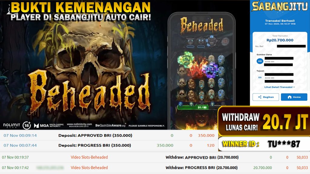 BUKTI KEMENANGAN 07 NOVEMBER DI GAME Beheaded WITHDRAW 20.700.000.,-