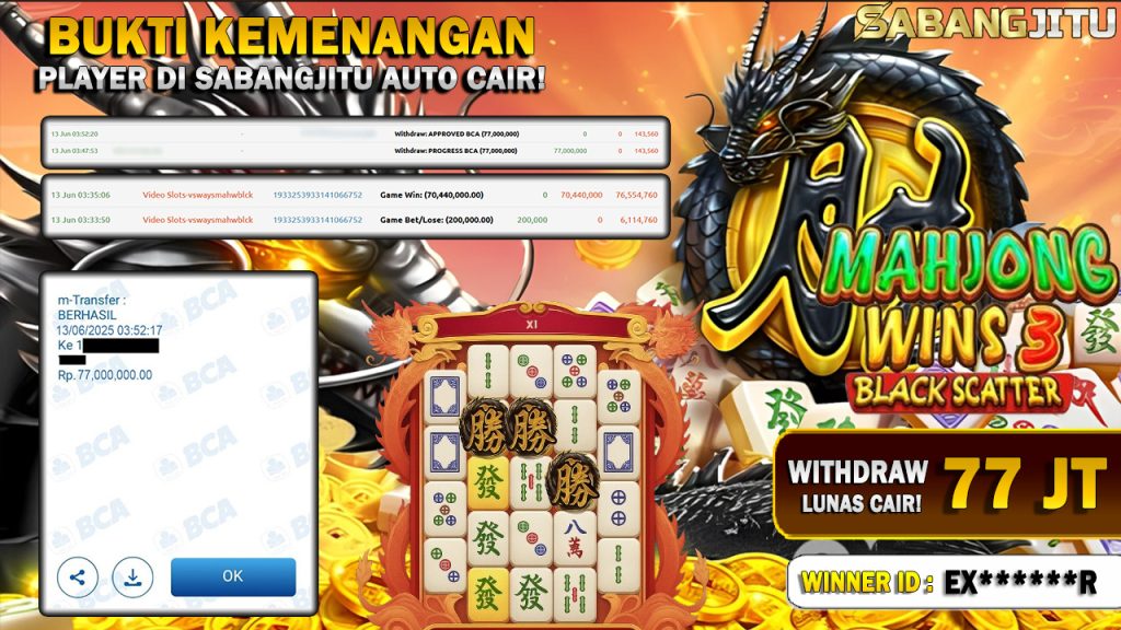 BUKTI KEMENANGAN 13 JUNI DI GAME MAHJONG WINS 3 WITHDRAW RP 77.000.000.,-