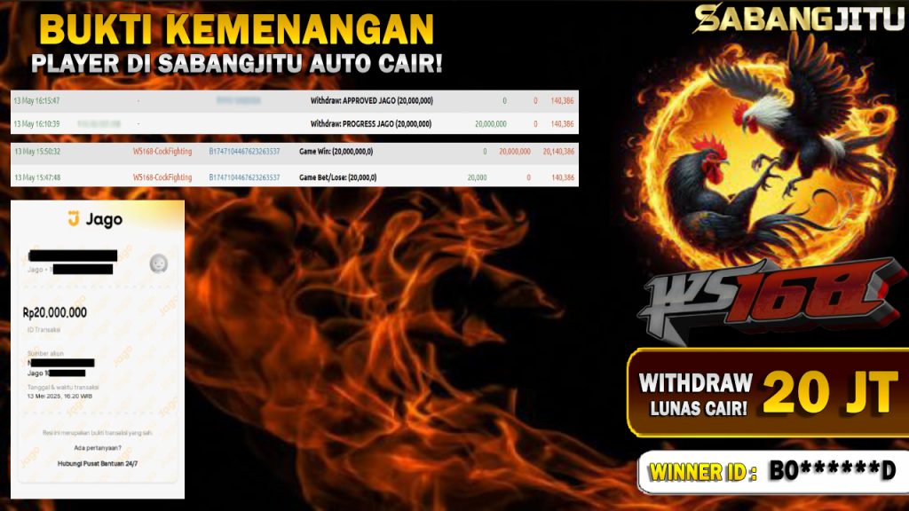 BUKTI KEMENANGAN 13 MEI DI GAME WS168-COCKFIGHTING WITHDRAW RP 20.000.000,-