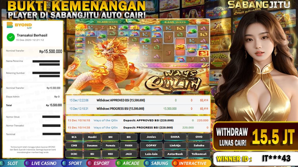 BUKTI KEMENANGAN 15 DESEMBER DI GAME Ways of the Qilin WITHDRAW 15.500.000.,-