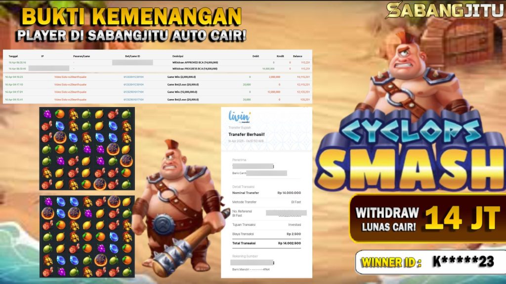 BUKTI KEMENANGAN 16 APRIL DI GAME CYCLOPS SMASH WD 14 JUTA