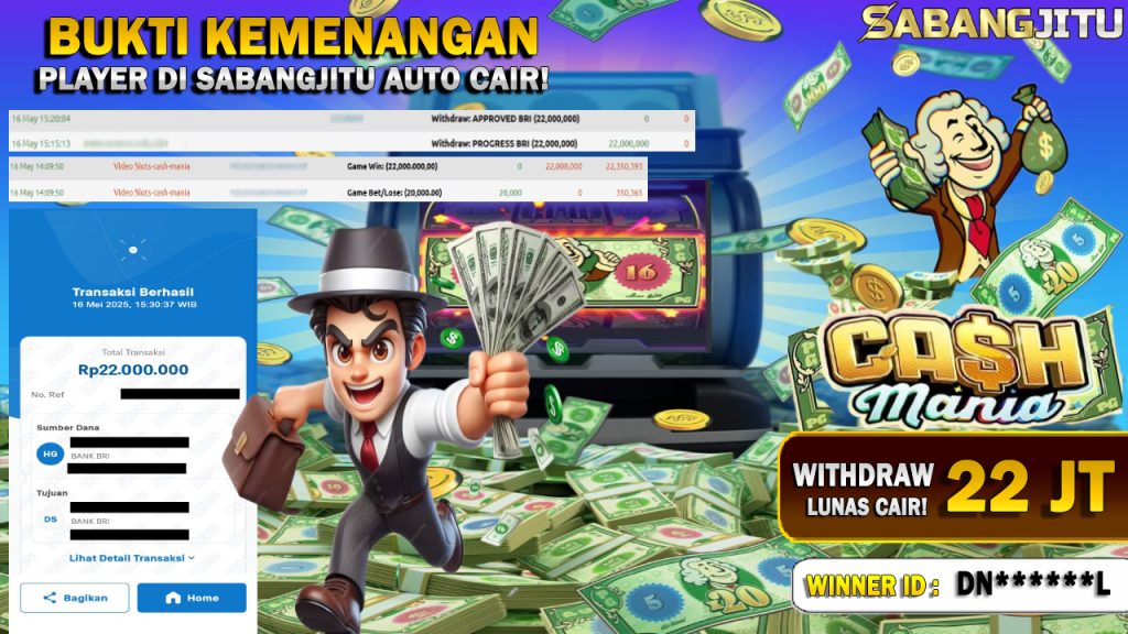 BUKTI KEMENANGAN 16 MEI DI GAME CASH-MANIA WITHDRAW RP 22.000.000.,-