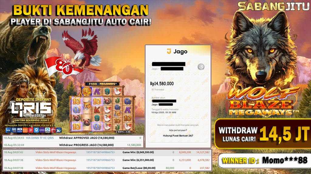 BUKTI KEMENANGAN 18 AGUSTUS DI GAME WOLF-BLAZE-MEGAWAYS WITHDRAW RP 14.580.000.,-