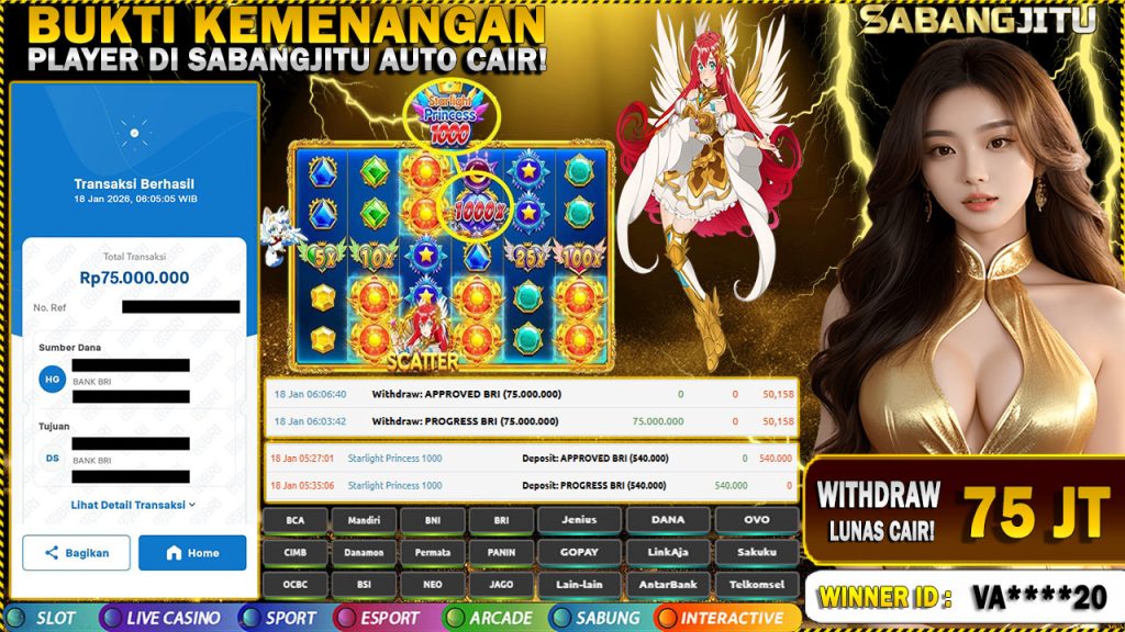 BUKTI KEMENANGAN 18 JANUARI DI GAME starlight princess 1000 WITHDRAW RP 75.000.000.,-