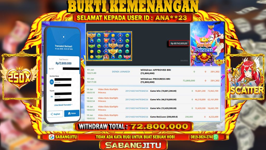 BUKTI KEMENANGAN 19 JANUARI DI GAME STARLIGHT PRINCESS-PRAGMATIC PLAY WITHDRAW 72.800.000.,-
