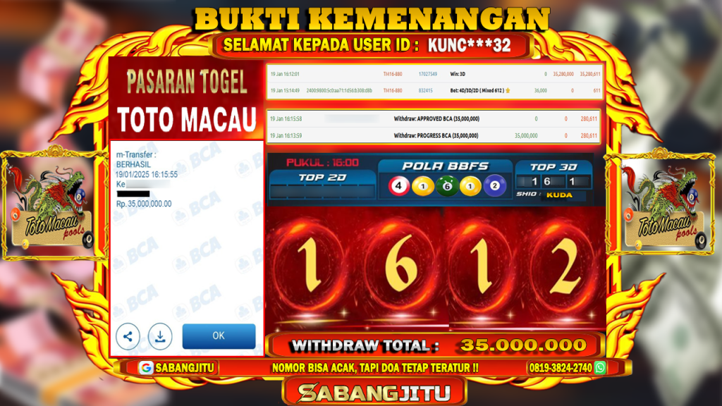 BUKTI KEMENANGAN 19 JANUARI DI GAME TOTO MACAU-TOGEL WITHDRAW 35.000.000.,-