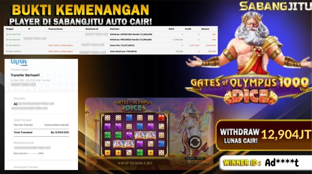 BUKTI KEMENANGAN 20 MARET 2025 DI GAME GATES OF OLYMPUS 1000 DICE WD 12.904.000 JUTA