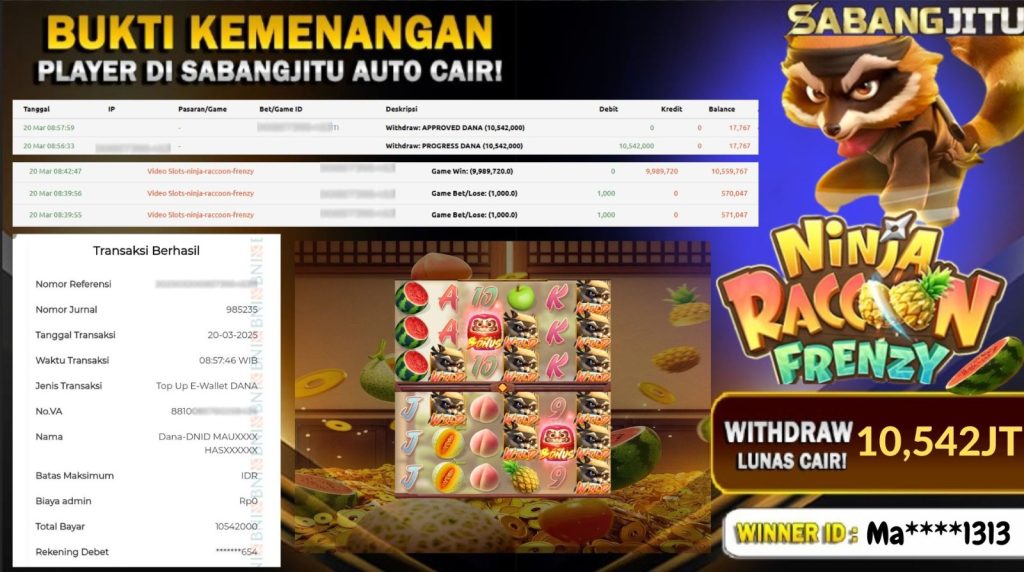 BUKTI KEMENANGAN 20 MARET 2025 DI GAME NINJA RACCOON FRENZY 10.542.000 JUTA