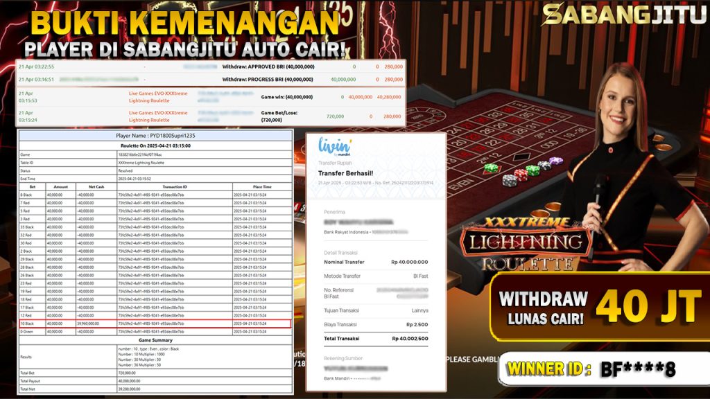 BUKTI KEMENANGAN 21 APRIL DI GAME LIVE CASINO XXXTREME LIGHTNING ROULETTE WITHDRAW RP 40.000.000.,-