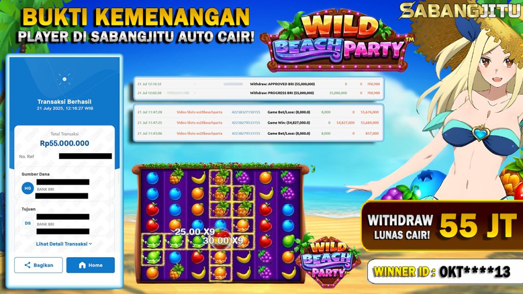BUKTI KEMENANGAN 21 JULI DI GAME WILD BEACH PARTY WITHDRAW RP 55.000.000.,-