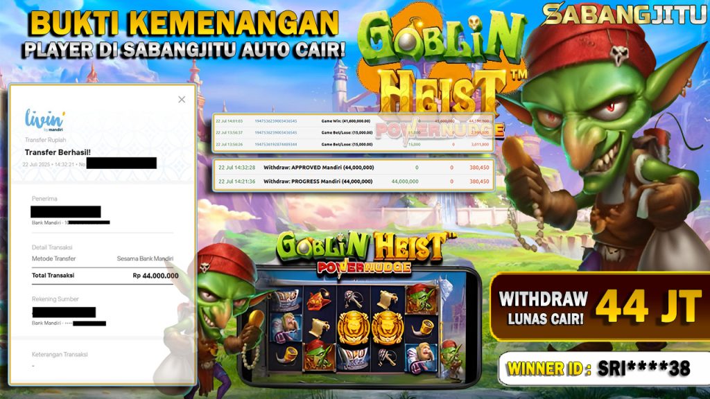 BUKTI KEMENANGAN 22 JULI DI GAME GOBLIN HEIST POWERNUDGE WITHDRAW RP 44.000.000.,-