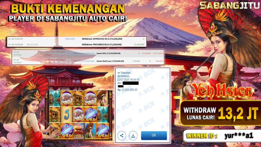 BUKTI KEMENANGAN 22 JULI DI GAME YEH-HSIEN-DELUXE WITHDRAW RP 13.200.000.,-