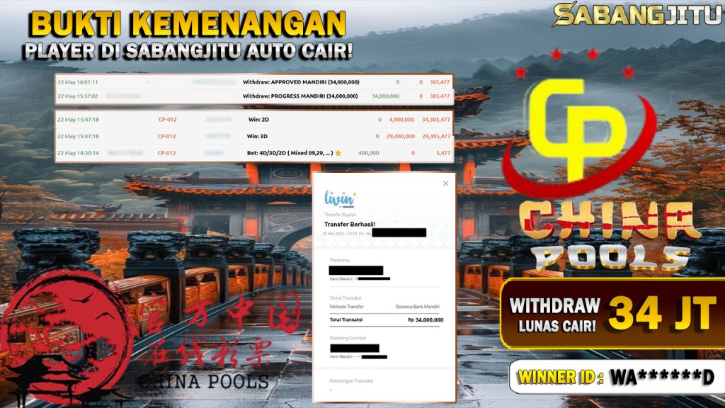 BUKTI KEMENANGAN 22 MEI DI PASARAN CHINA POOLS WITHDRAW RP 34.000.000.,-