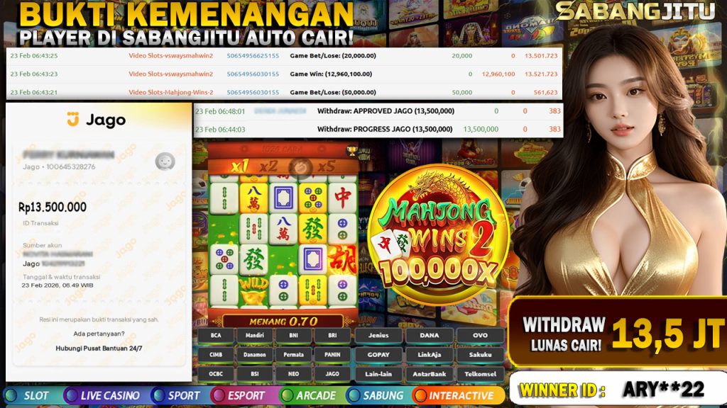 BUKTI KEMENANGAN 23 FEBRUARI DI GAME MAHJONG WINS 2-PRAGMATIC PLAY WITHDRAW 13.500.000.,-