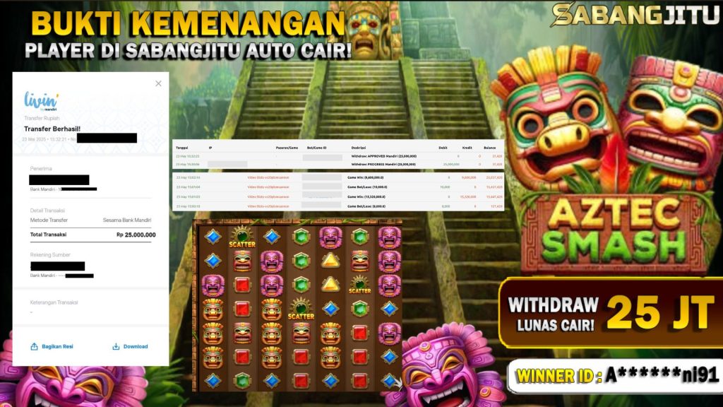 BUKTI KEMENANGAN 23 MEI DI GAME PRAGMATIC PLAY AZTEC SMASH WITHDRAW RP 25.000.000.,-