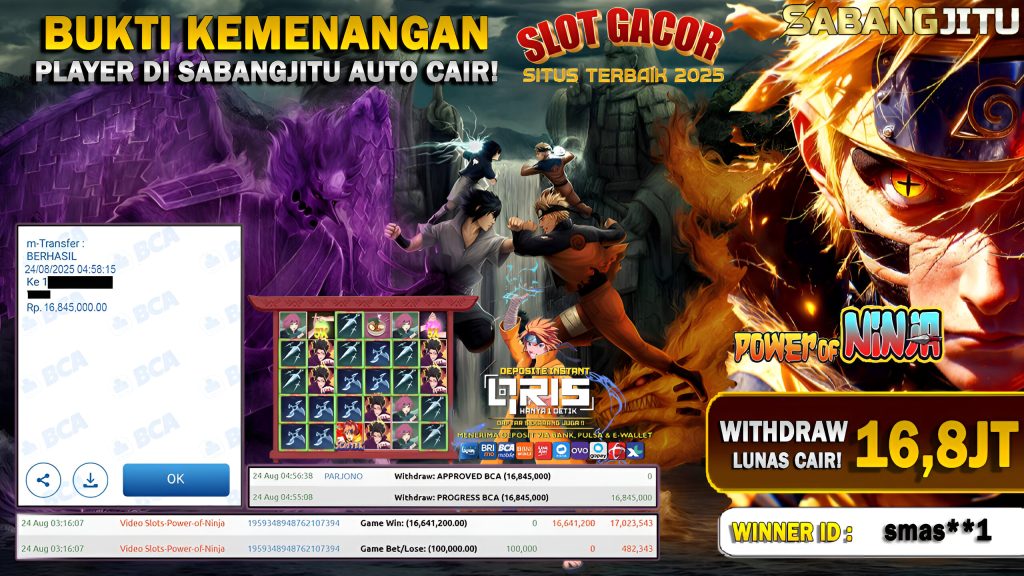 BUKTI KEMENANGAN 24 AGUSTUS DI GAME PRAGMATIC-PLAY POWER OF NINJA WITHDRAW RP 16.845.000.,-
