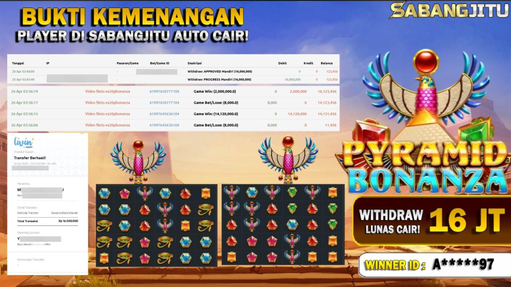 BUKTI KEMENANGAN 26 APRIL DI GAME PYRAMID BONANZA WD RP 16.000.000.,- JUTA