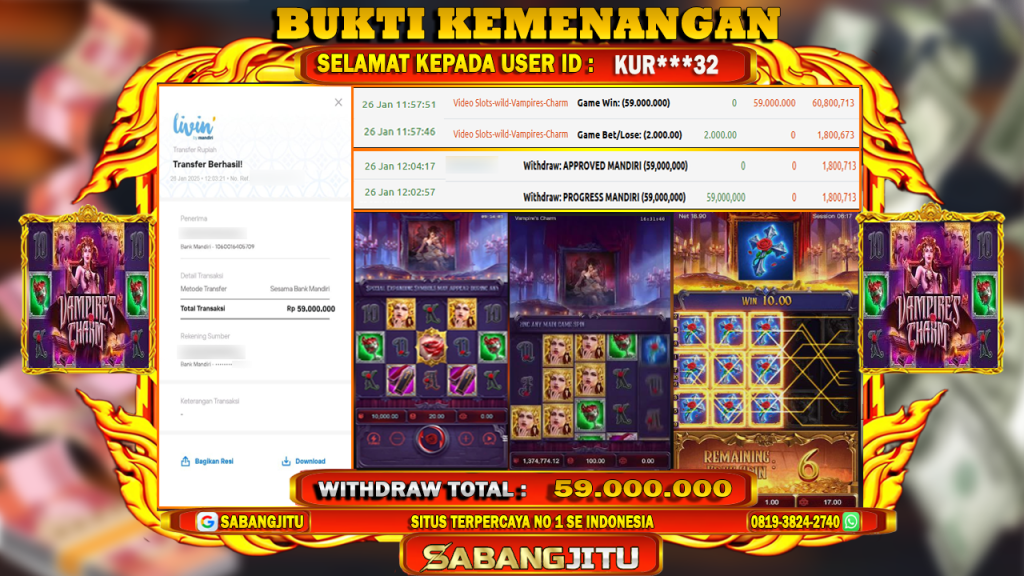 BUKTI KEMENANGAN 26 JANUARY DI GAME VAMPIRES CHARM -PG SOFT WITHDRAW 59.000.000.,-