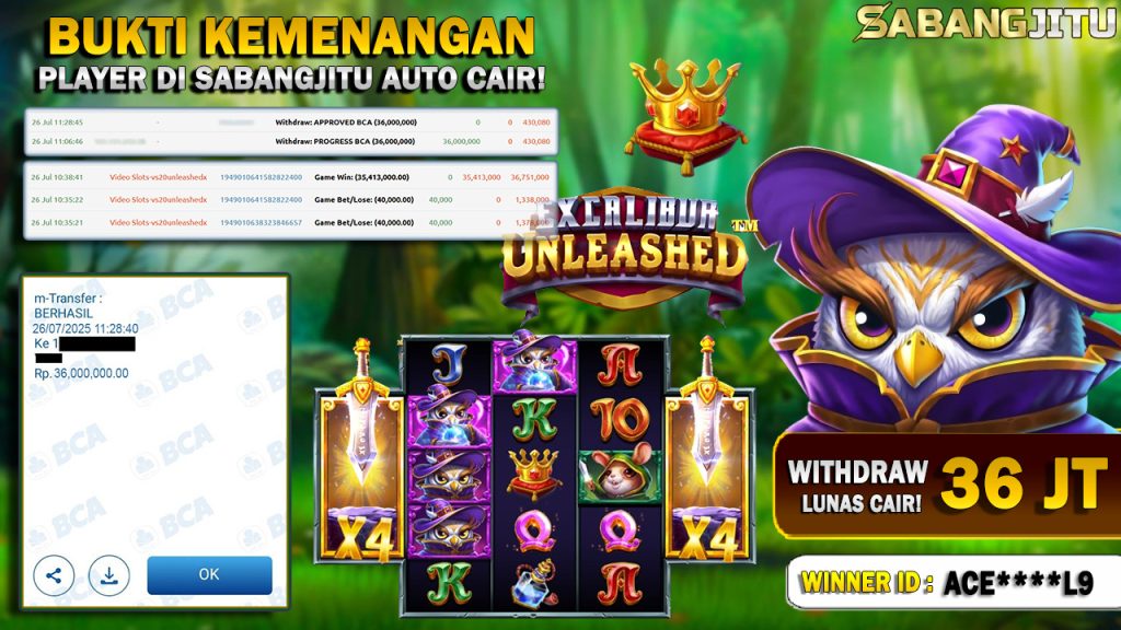 BUKTI KEMENANGAN 26 JULI DI GAME EXCALIBUR UNLEASHED WITHDRAW RP 36.000.000.,-