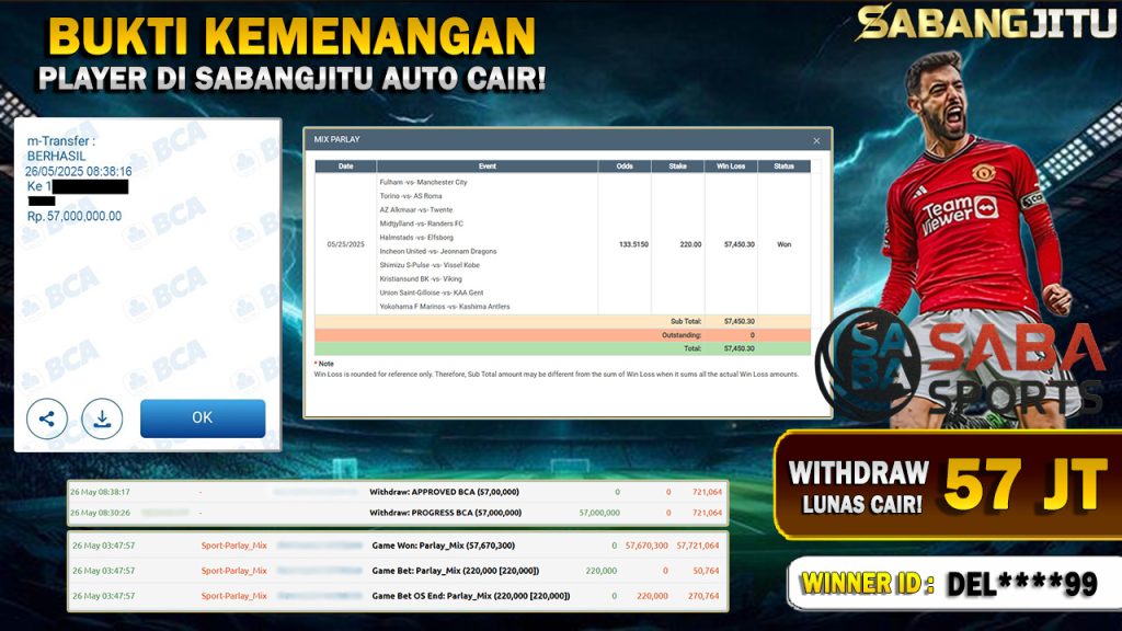 BUKTI KEMENANGAN 26 MEI DI GAME SABA SPORT WITHDRAW RP 57.000.000.,-