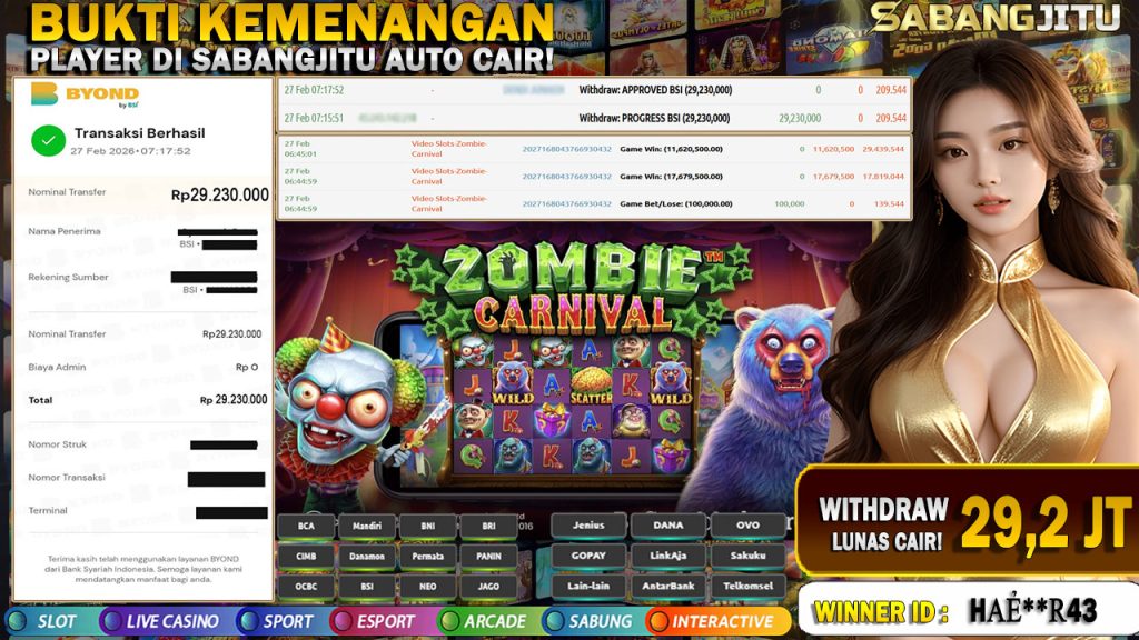 BUKTI KEMENANGAN 27 FEBRUARI DI GAME Zombie Carnival – PRAGMATIC-PLAY WITHDRAW RP 29.230.000.,-