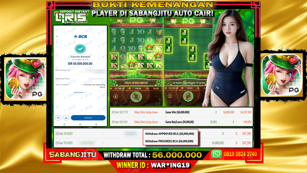 BUKTI KEMENANGAN 28 MARET DI GAME LUCKY CLOVER LADY ( POCKET GAME SOFT ) WITHDRAW 56.000.000.,-