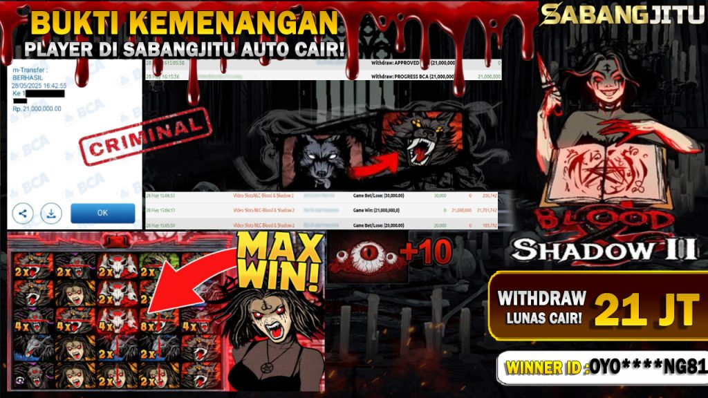 BUKTI KEMENANGAN 28 MEI DI GAME BLOOD-SHADOW ll WITHDRAW RP 21.000.000.,-