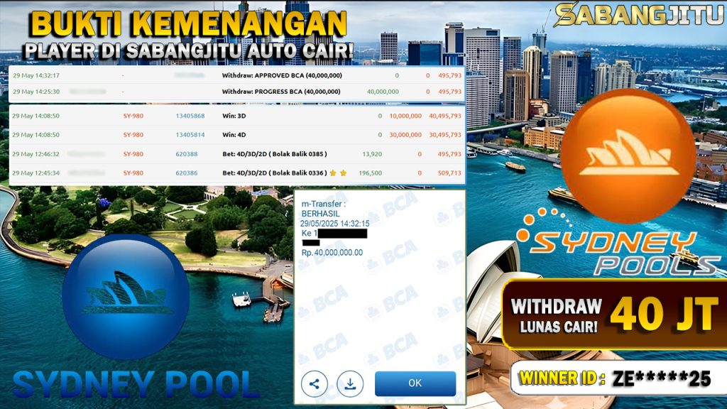 BUKTI KEMENANGAN 29 MEI DI PASARAN SYDNEY POOLS WITHDRAW RP 40.000.000.,-