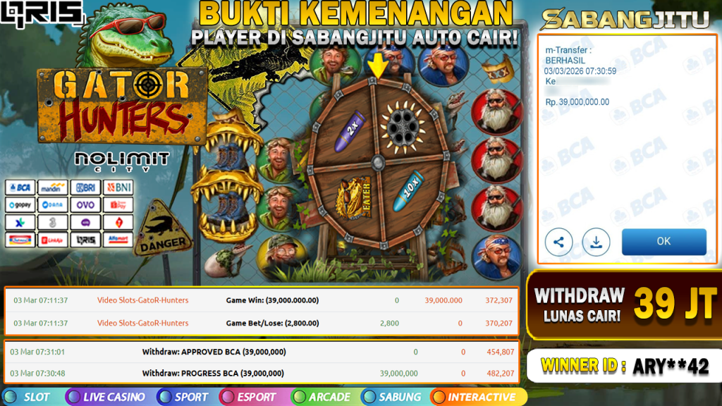 BUKTI KEMENANGAN 3 MARET DI GAME GATOR HUNTERS WITHDRAW RP 39.000.000.-