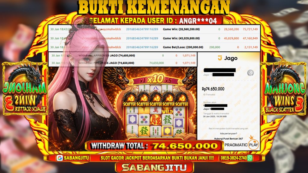 BUKTI KEMENANGAN 30 JANUARI DI GAME MAHJONG WINS 3 BLACK SCATTER-PRAGMATIC PLAY WITHDRAW 74.650.000.,-