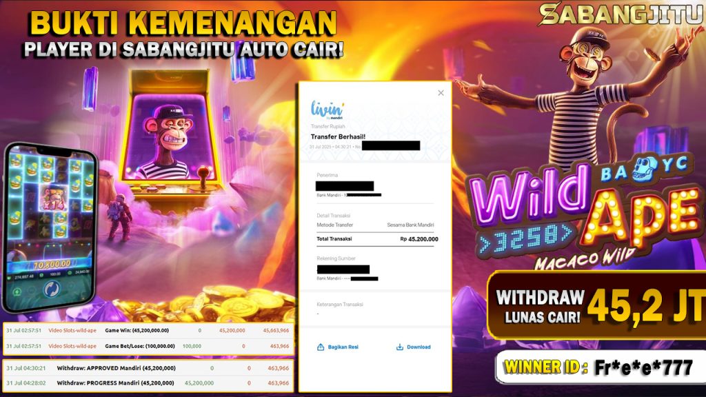 BUKTI KEMENANGAN 31 JULI DI GAME PG-SOFT WILD APE WITHDRAW RP 45.200.000.,-