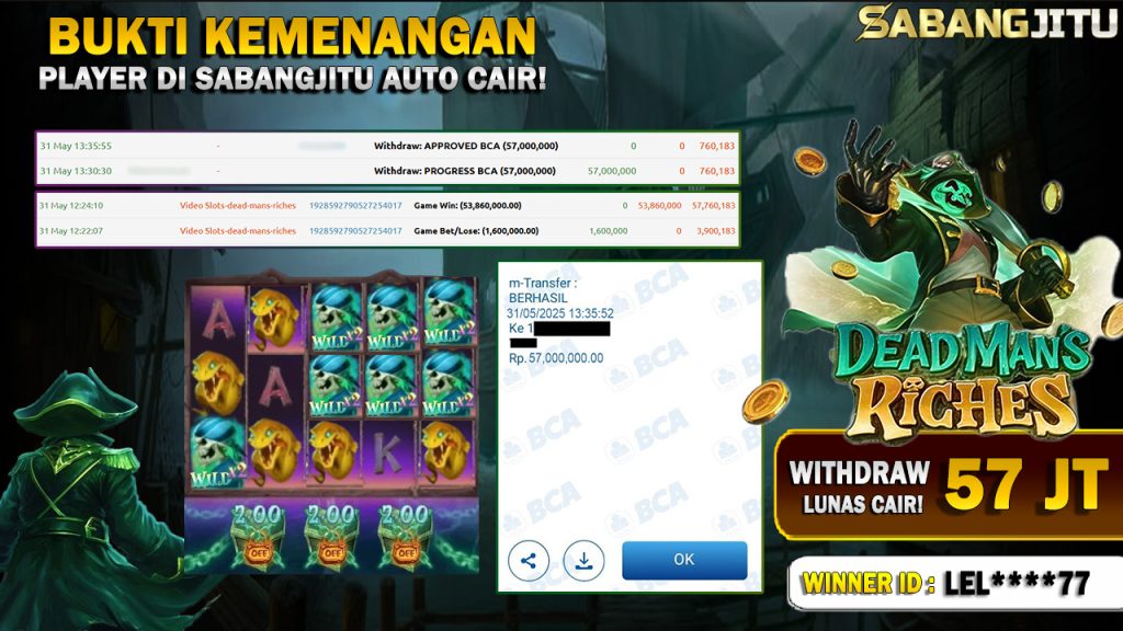 BUKTI KEMENANGAN 31 MEI DI GAME DEAD MAN’S RICHES WITHDRAW RP 57.000.000.,-